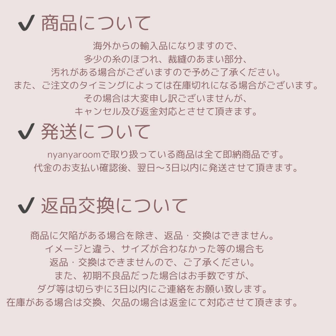 商品に欠陥がある場合を除き、返品・交換はできません。イメージとちがう、サイズが合わなかった等の場合も返品・交換はできませんのでご了承下さい。